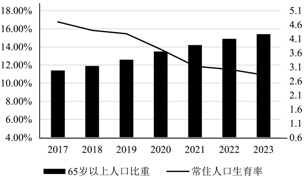 图1 65岁及以上常住人口占比和常住人口生育率(单位:%)