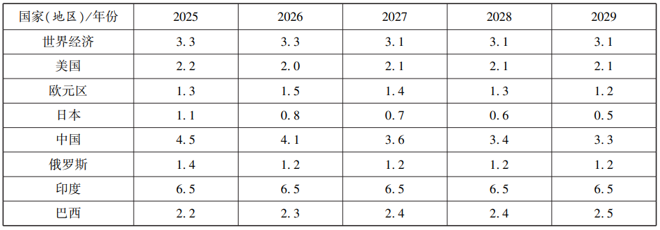 国际宏观经济呈现温和复苏态势,但宏观经济发展风险仍然存在,经济动能有待增强。一是全球经济增长下行风险显著,国际货币基金组织对世界主要经济体的经济预测数据显示,“十五五”时期世界经济增速将从2025年的3.3%逐步下降至期末的3.1%,各国经济增长呈现显著的下行趋势,全球经济仍有陷入衰退的风险(表1)。二是国际经济分化趋势明显,新兴市场和发展中国家经济体增速快于发达国家经济体,美国经济增长前景的不确性增大,欧洲经济复苏仍显疲软(表2)。三是金融危机、债务危机风险仍然较高,部分国家通胀水平和债务水平居高不下,世界经济体流动性宽松或将加大“滞胀”风险。